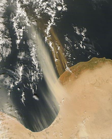 Mineral dust has many other effects on our planet. It can help form clouds or change atmospheric chemistry. When the dust settles in water or on land it can provide nutrients for ecosystem growth. If it falls on snow or ice, mineral dust can increase sunlight absorption and accelerate melting. Mineral dust in the air can reduce visibility or harm human health.