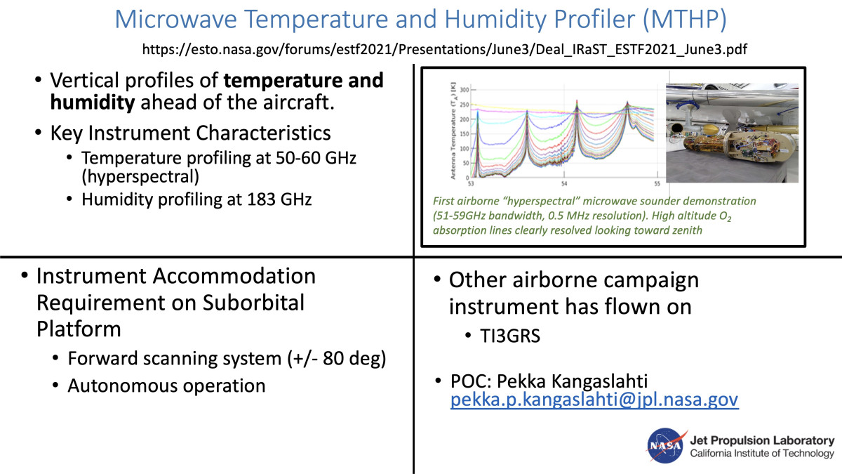 The Microwave Temperature and Humidity Profiler (MTHP) is a microwave radiometer that measures two frequency bands at 60 GHz and 183 GHz to produce vertical profiles of temperature and humidity ahead of the aircraft. The MTHP builds on over three decades of Microwave Temperature Profiler (MTP) operation at JPL, where the MTP has logged over 5500 flight hours of various aircraft.
