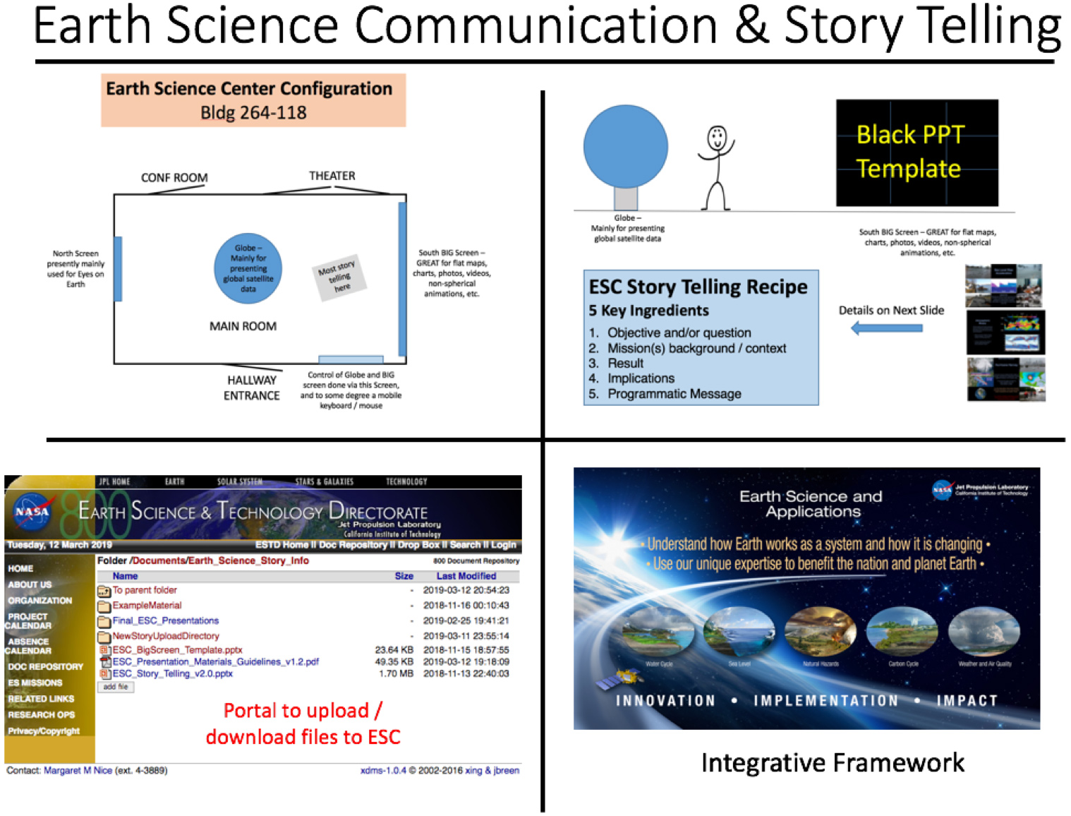 ESTD has moved to an open access paradigm for Earth Science Center (ESC) storytelling. A foundational element of this is to utilize Microsoft Powerpoint (PPT) to the full extent possible in the creation and maturation of ESC stories for the ESC 12' x 8' Video Wall. This paradigm will allow for significant enhancements to the past ad hoc presentation paradigm for getting ready and presenting to VIPs. With the development and adoption of a few standards for our PPT presentations, we enable more of the Earth Science community to more quickly take advantage of the ESC and associated hardware, with minimal assistance from venue specialists. Thus, in addition to use for JPL tours and Earth Science and Technology high level visitors, any project or mission is in a position to readily utilize the ESC Video Wall, with augmentations provided by the globe, 3D theater and internal conference room.